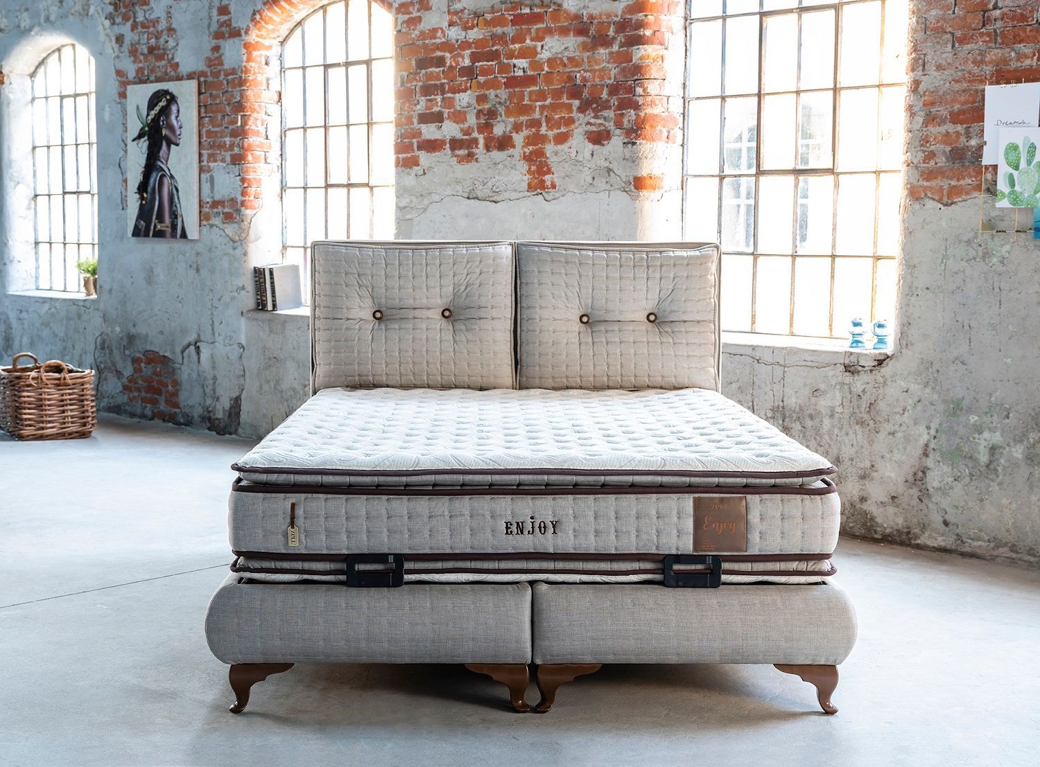 Uygun fiyat aralıklarıyla, baza ve yatak modelleri uygun seçeneklerle takım olarak sunulmuştur. Yatak, baza ve baza başlığı özel renk, desen ve kumaş tasarımlarıyla, ince detaylarla süslenmiş, kaliteli malzemelerle dizayn edilmiştir.